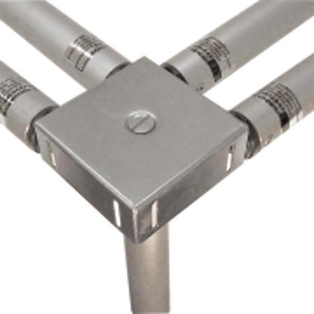 The Double Wall Hanger is a square metal cap that sits into the top of the upright and allows up to eight crossbars – this is a quick and easy way to run a double drape line without any metal work on show from any angle.
